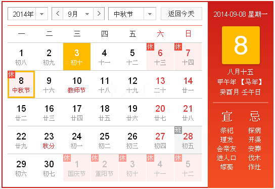 2014中秋節(jié)放假安排時(shí)間表: