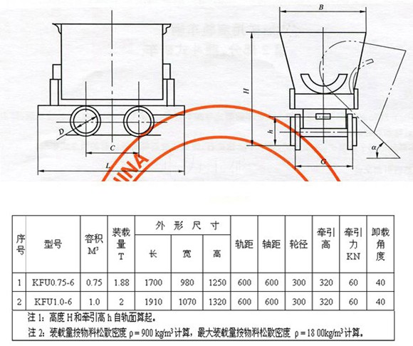 翻斗式礦車型號(hào)表示含義: 例:KFU0.75-6翻斗式礦車
