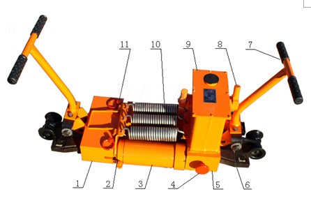 主要結(jié)構(gòu)如圖:1前夾具體、2活塞桿、3油缸、4回油閥(另一側(cè)為備用回油閥)、5后夾具體、6斜鐵(6塊)、7扳把、8油泵搖桿、9油箱、10復(fù)位彈簧、11小安全銷(2個(gè))。㈡工作原理:增大軌縫時(shí),使用前夾具體1與后夾具體5,通過四個(gè)柱塞泵將液壓油壓入雙油缸中,活塞2向外伸出,前、后夾具體中的斜鐵夾住兩條鋼軌后,推動(dòng)鋼軌使兩條鋼軌間的縫隙增大,從而達(dá)到調(diào)整軌縫的目的。四、使用方法和保養(yǎng)正確的使用與保養(yǎng),對保證機(jī)具的正常工作和延長其使用壽命具有重要作用,操作者應(yīng)認(rèn)真閱讀本說明書,以了解各部結(jié)構(gòu)和作用。㈠、使用前檢查1、油箱內(nèi)油面高度是否達(dá)到油箱高度的2/3,夏季使用40#機(jī)油,冬季使用20#機(jī)油,加油時(shí)應(yīng)過濾。2、操縱部分是否靈活可靠。3、回油閥啟閉是否正常,各液壓件工作是否正常。4、各連接緊固部位是否松動(dòng)和有無漏油現(xiàn)象。㈡、操作步驟1、將機(jī)具置于被調(diào)整的兩根鋼軌接頭處,使軌縫位于前夾具體1與后夾具體5之間。2、向下搬動(dòng)夾具體上的操縱扳把7使夾具體落在鋼軌上。3、順時(shí)針旋緊回油閥4,用操縱桿搖動(dòng)油泵搖桿8,使液壓油輸入工作油缸3中,當(dāng)活塞2伸長20mm后,斜鐵則可夾住鋼軌,繼續(xù)搖動(dòng)操縱桿即能達(dá)到調(diào)整軌縫作業(yè)目的。4、每次軌縫調(diào)整完畢應(yīng)按逆時(shí)針方向先旋開回油閥,然后向上搬動(dòng)扳把7松開斜鐵,使工作油缸活塞在拉簧作用下復(fù)位,即完成一次工作循環(huán)。(本機(jī)設(shè)有兩個(gè)回油閥,當(dāng)其中一個(gè)出故障時(shí),打開另一個(gè)回油閥,即可使油缸復(fù)位,提高了本機(jī)的安全性能。)5、完成作業(yè)后,向上搬動(dòng)各夾具體上的扳把7,通過棘爪將走行輪落在鋼軌面上,推行至下一軌縫處或整機(jī)下道。6、油箱內(nèi)設(shè)有溢流閥,其壓力在出廠前已調(diào)整至52MPa,當(dāng)負(fù)載過大時(shí),溢流閥卸荷,從而保證機(jī)具使用安全。㈢故障排除