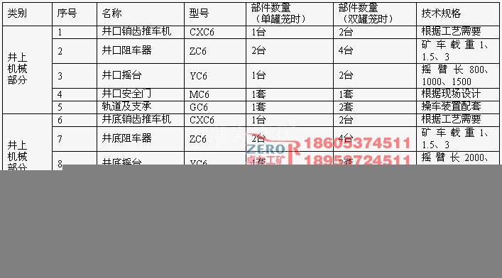 下表給出了在單罐籠提升和雙罐籠提升兩種情況下,井口和井底車場所用銷齒操車設備的組成明細: